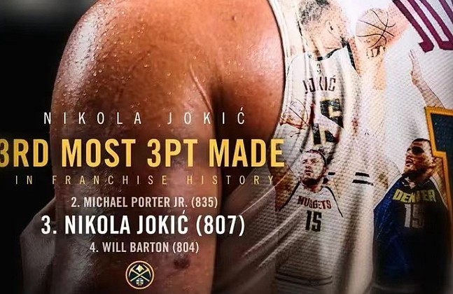 掘金上场104-118不敌勇士,本场约基奇三分7中4,空砍33分12篮板9助攻2抢断。此役过后,约基奇生涯至今命中807记三分在队史三分榜上超越威尔-巴顿,升至第3。队史三分榜前二是默里(1144)和小波特(835)。